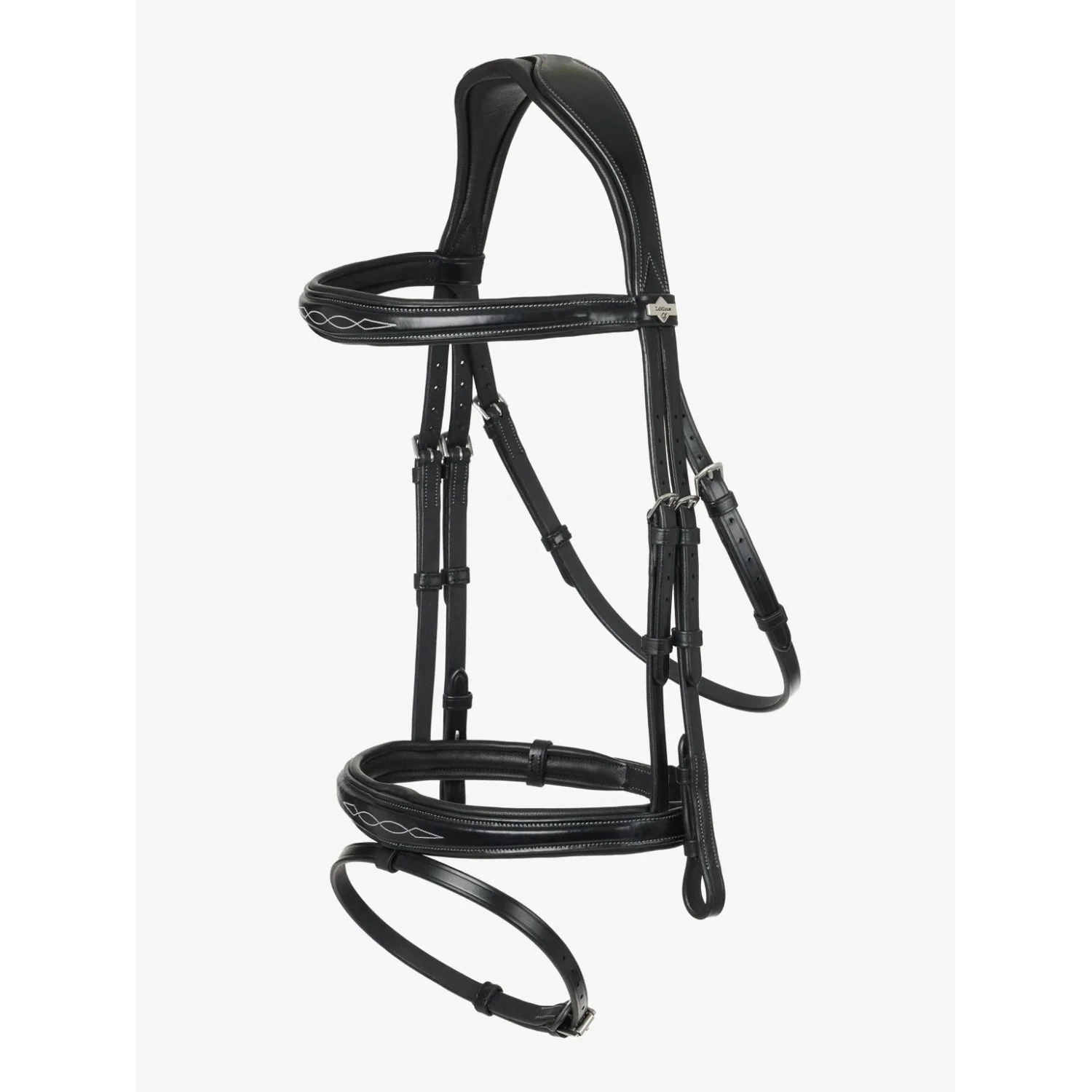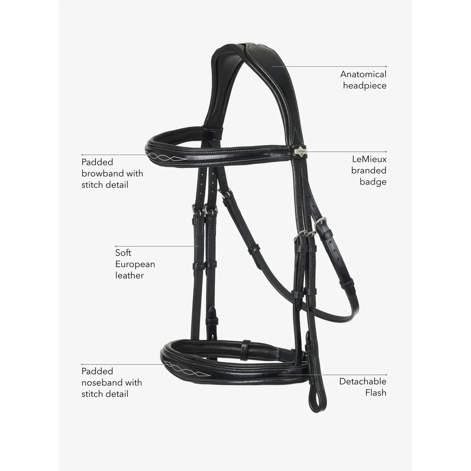 The LeMieux Competition Bridle is show quality with an elegant shaped, padded browband and noseband with decorative stitching.