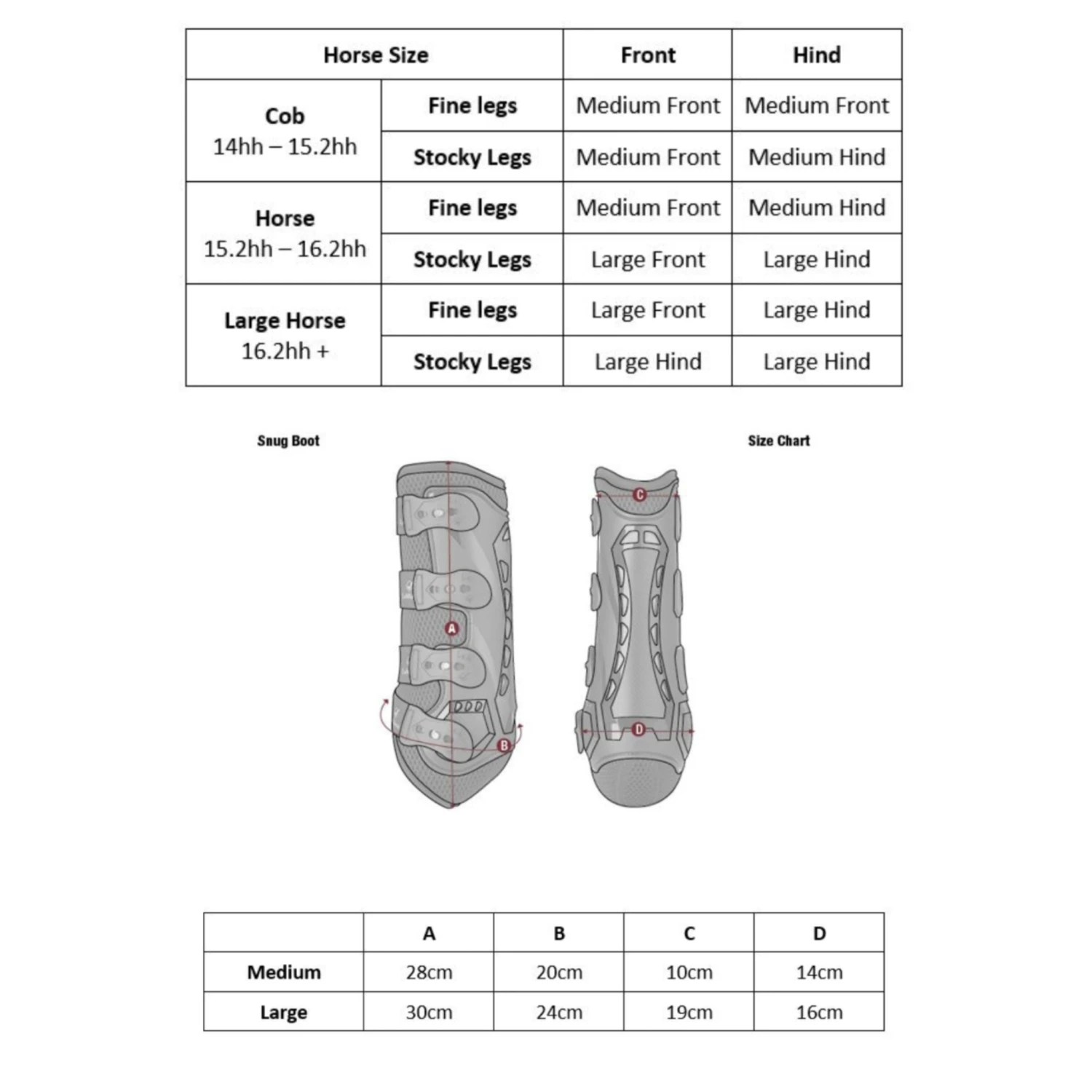 Please note Snug Boots are interchangeable with hind boots having a wider inner lining so can also be used on front legs of large boned horses.