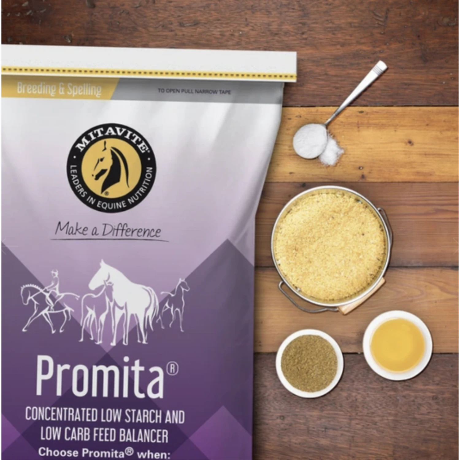 Mitavite® Promita® is a concentrated low starch feed balancer that provides high levels of quality, easily digested protein, high levels of Essential Amino Acids, vitamins, minerals and electrolytes. Promita® is an ideal additive to reinforce diets at critical growth periods such as mares in the last 3 months of pregnancy or during lactation. Also suitable for foals and weanlings, horses recovering from injury, surgery or are prone to laminitis, in light work, or good doers needing all the essential vitamins and minerals.