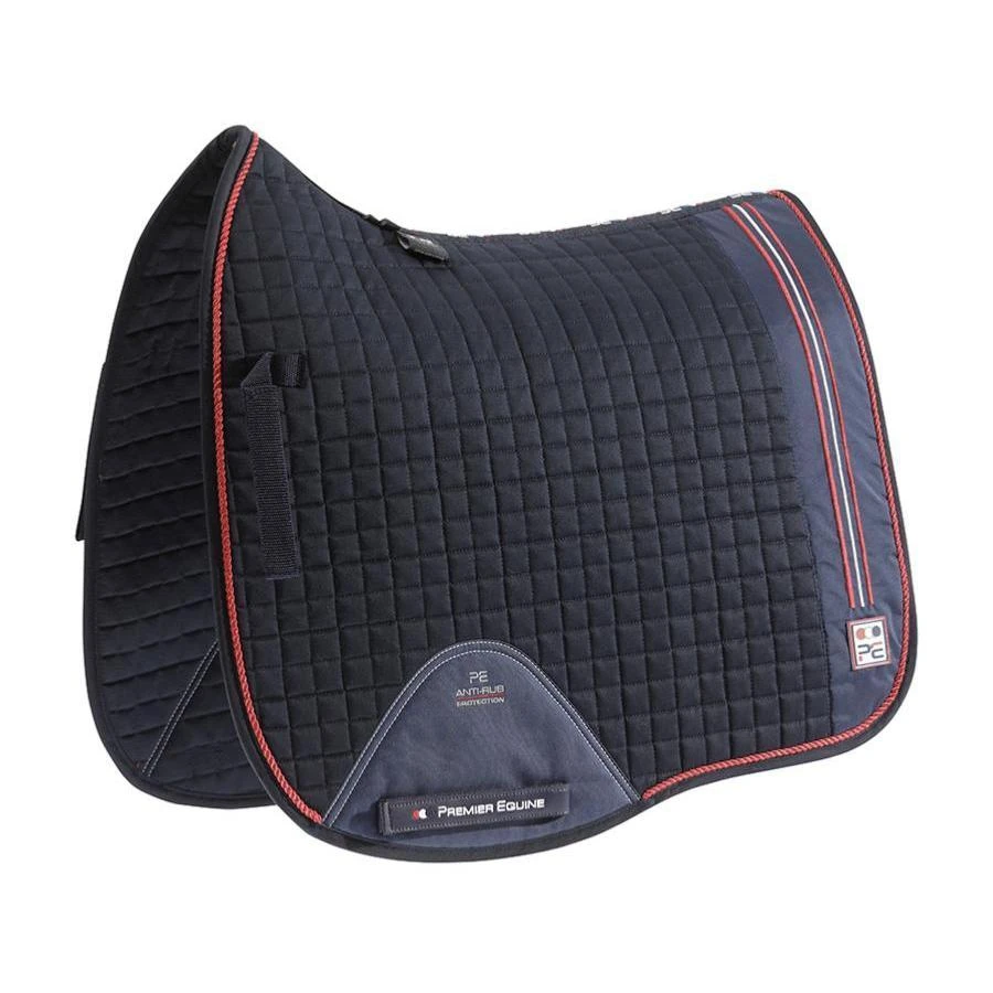 Our Sports European Cotton Dressage Square boasts a luxury, professional appearance. Made from beautifully quilted cotton, it is breathable and helps to draw moisture. A European style cutaway hem and decorative twisted ropes combined with stylish, âPEâ branded strip panels to the rear create a crisp, sporting aesthetic. Adjustable Velcro straps easily secure the pad under saddle and our signature 600D anti-rub protection zones help to prevent friction and rubbing from the girth. A stunning saddle pad, perfect for everyday or competition use under dressage saddles.